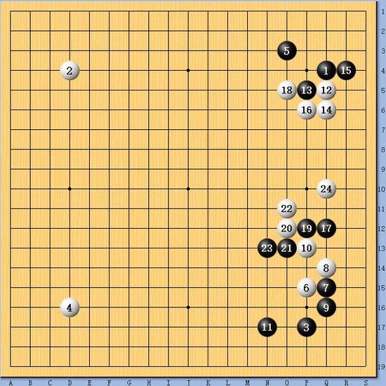 現在朴廷恆選擇阿爾法白布局開局,顯然他也認為這個局面執白有利。到第24手,雙方走棋與人機大戰第五盤一模一樣。