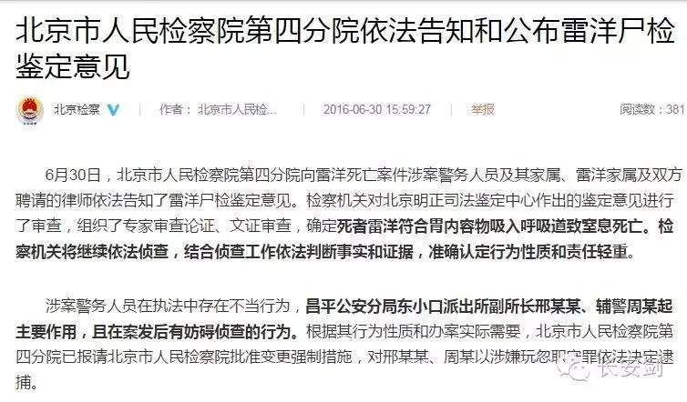看完這個調查結論,相信不少人會像長安君(微信ID:changan-j)一樣,有很多“想不到”。想不到,雷洋會是這樣的死因;想不到,警察在其中起到這樣的作用;想不到,檢方公布的結論,與此前眾聲喧譁中的“各執一詞”,都不相同...... 面對種種“想不到”,你,怎麼看?長安君有三點看法—— 看法一:“正義也許會遲到,但它從不缺席” 雷洋案演變到今天,每一步,大眾都耳熟能詳: 從5月初,輿論場“眾口一詞”地指責一方,到警方幾次回應均遭質疑,到雷洋家屬聘請律師,到檢察院介入,到家屬同意下啟動屍檢,到涉事警察被檢方立案偵查,再到5位警務人員(包括輔警)近日聘請律師,雙方不斷爭鳴、辯護。表面看,混亂龐雜,實際上,一條主線卻很清晰。 這條主線,就是法治。