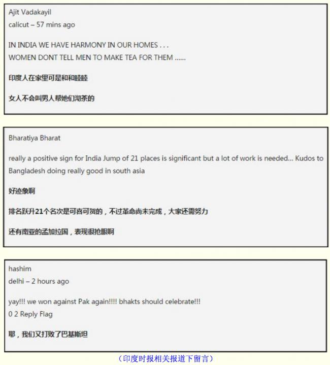 印度此次排名第87位。据印度时报报道,多亏了工资和教育方面男女差距的缩小,比去年上升21个名次。可喜可贺。