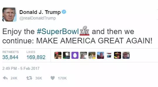 連忙於治國的川普都要騰出時間來觀看比賽。川普可是愛國者隊的支持者哦。上個月的就職典禮上,他還預祝愛國者隊大獲全勝,一口好奶。