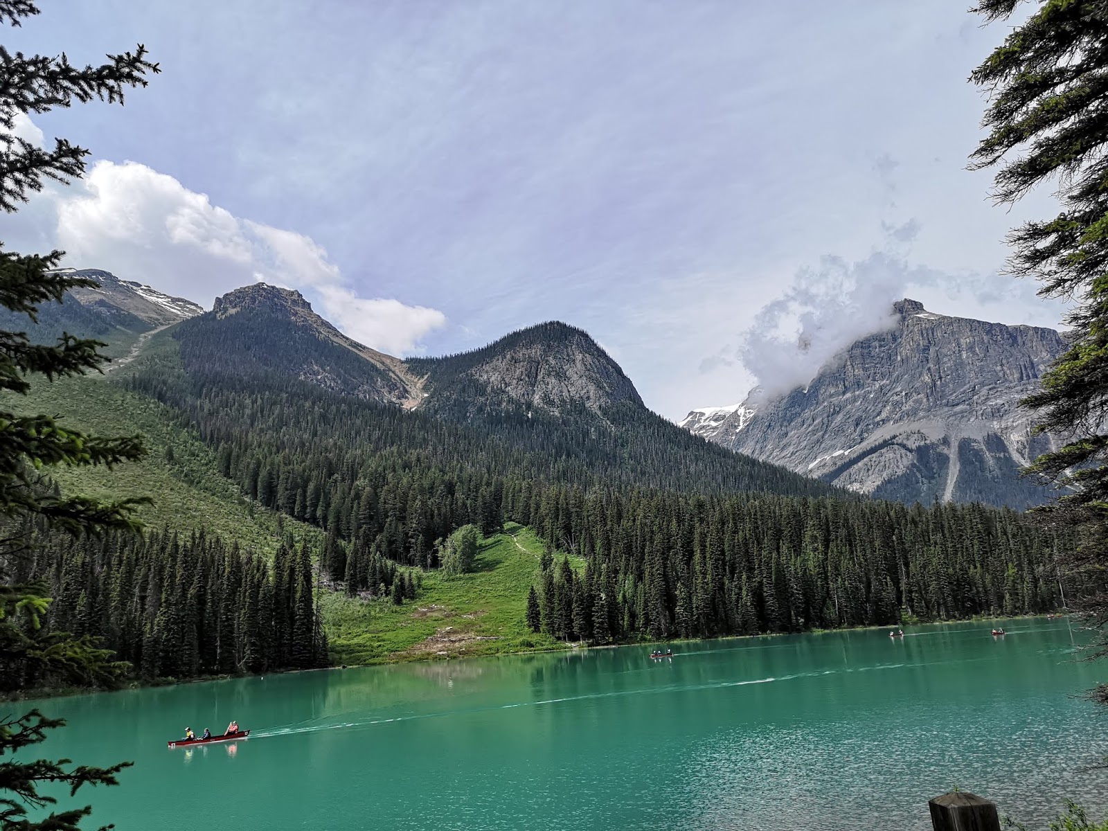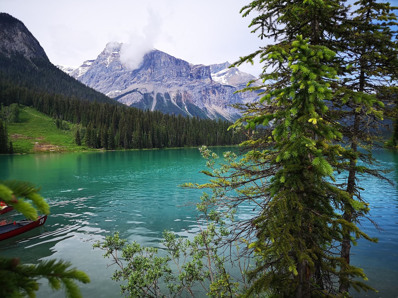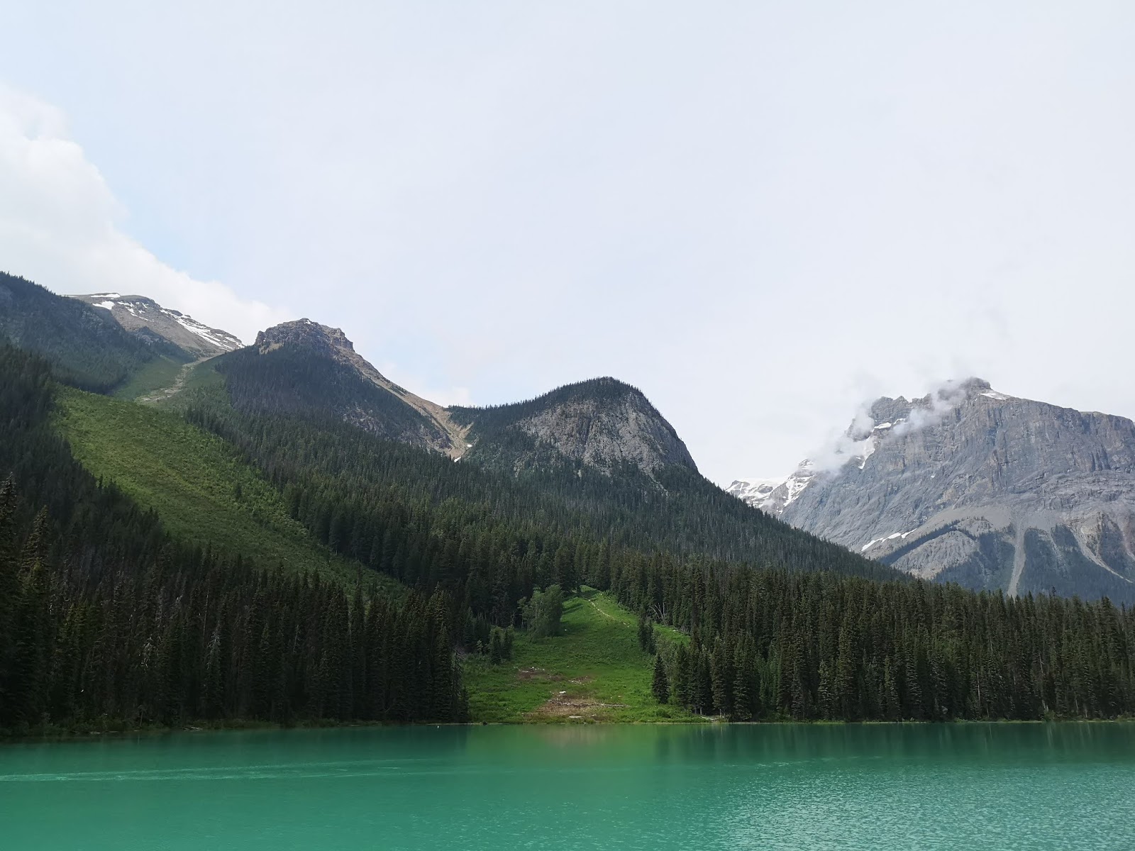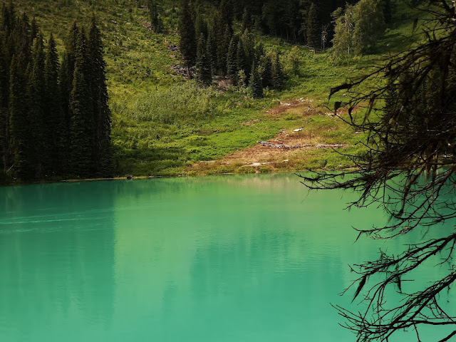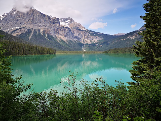 翡翠湖(Emerald Lake),此时阳光灿烂立刻被翡翠湖的美丽光色惊呆!必须绕湖走一圈!一周5.2公里,美极非语言能形容:
