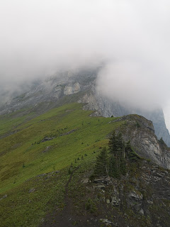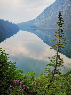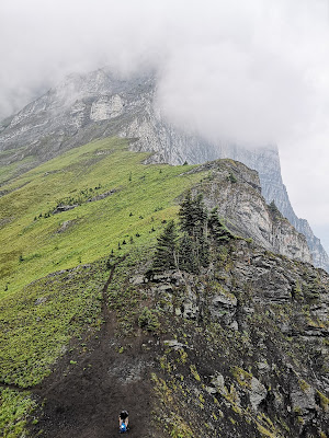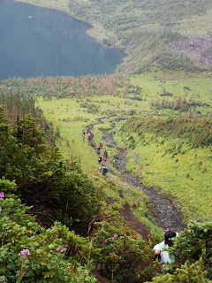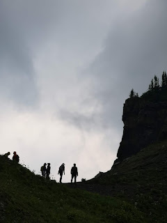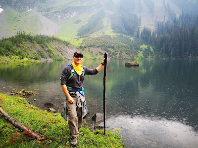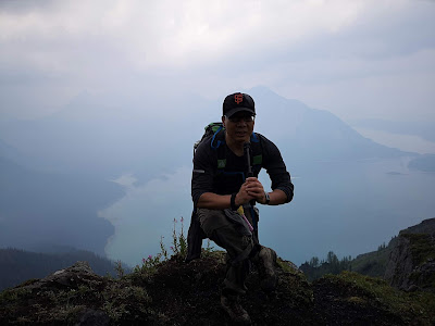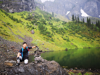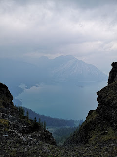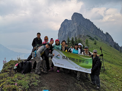 来到最后的一段攀登,到了近处才能看见匍匐在山坡中的路径,由于细雨不停登峰的泥路崎岖,有一段山路几乎垂直。路上有不少西人放弃言待晴朗之他日,我们坚持登顶的会员们相互鼓励,抖擞精神,一口气的登上色锐尔峰,”无限风光在险峰!”山顶云雾缭绕,影影绰绰,恍如置身仙境。色锐尔峰挺拔峻峭,鸟瞰upper和lower Kanannaskis湖,对视Indefatigable山峰,众人欢呼雀跃搔首弄姿,大呼过瘾,直感骄傲,似乎把下山的担心抛之九霄云外。一路上山倒也不少野花野草,什么形状也有,各种颜色也有,挨挨挤挤,芊芊莽莽,似乎要把巉岩的山石装扮起来。这些各样的植物树木不管生长在如何环境,总是带着好心情点缀着周围的世界,这种境界“吸翠霞而夭矫”,是我们学习的楷模。
