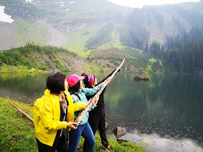 沿着平静的湖水,迎着斜风细雨,谈笑间已到罗森湖。33人中大约有一半依然威猛:不到色峰不好汉不巾帼,但另一半人由于各种原因决定返回,随队Tina和Michael带有急救及医疗装备,及时细致地处理了一些小事故,大家互相友爱关怀,是一切旅行的根基。