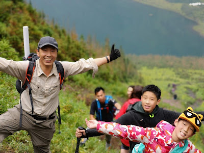 “荡胸生层云,云海四茫茫”,众人稍事休息加粮添水,准备“上山容易下山难”,看着陡峭的下山泥石小径,难以立足,众人不由倒吸一口凉气,尤其是有些登山新手居然穿着旅游鞋,要么就是艺高人胆大,要么就是不听“老人”言。虽然有人胆怯有人心慌,但所有登峰人员携手鼓励众志成城,安全顺利下得山来。自古少年出英雄,只见牛牛身轻如燕转眼间不见踪影,马队不甘落后飞身踉跄追赶;黄金组合之Mona脚蹬旅游鞋,屁股贴着山坡滑行而下,口中大喊:赔了一件牛仔裤!少年南希下山缺乏经验但沉着稳定;弱不禁风之Alice在Michael全力相助下飘然而下:“下来了,我还是一个整人!”。马队看在眼里喜在心里,不由湿了起来: