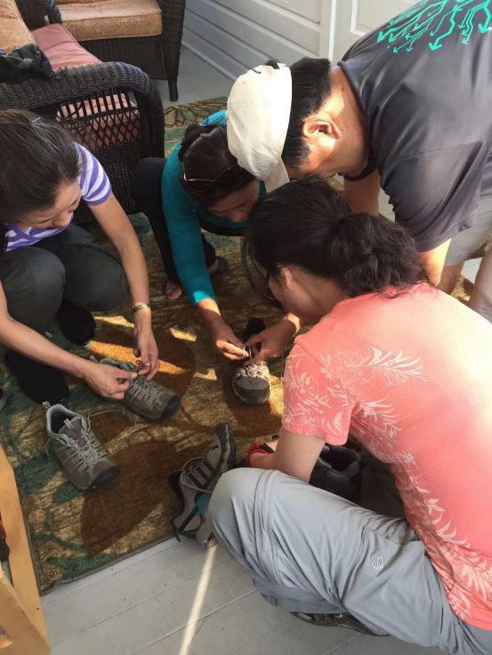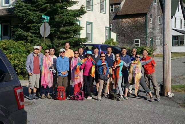 Acadia 絕壁攀爬,王璇着紅衣殿後 和她一起爬山,她會不聲不響地排在最後。她一路非常輕鬆,總要大家別急,慢一點,照顧體能差些的同學。呂同學告訴我,其實她的能力是最好的,她已經跑過好幾個馬拉鬆了。她這樣做,不是圖自己過癮,是為了大家安全愉快。為了讓大家避免受傷,她會手把手地教大家繫鞋帶。