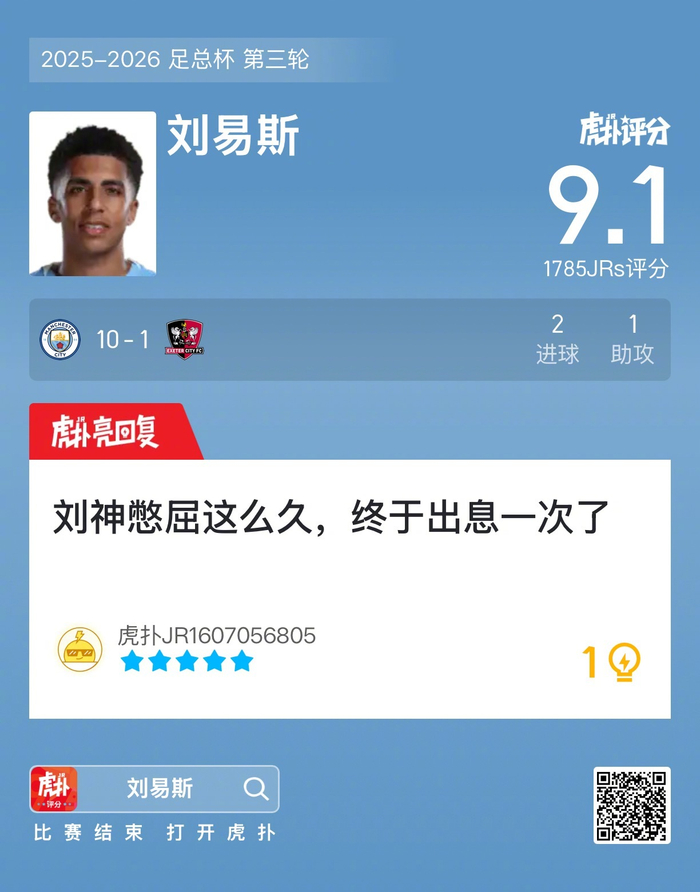 #曼城10比1埃克塞特城# 刘易斯打进两球,贡献一次助攻,赛后收获9.1的虎扑评分!