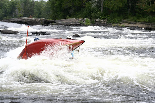 Madawaska, 2008白水之旅的最後一站 (3) (1) Follow the link: http://bbs.creaders.net/sports/bbsviewer.php?trd_id=288049 (2) Follow the link: http://bbs.creaders.net/sports/bbsviewer.php?trd_id=288286 不多時,遠遠的聽見了嘩嘩的水聲,第一個急流,小島急流,就在眼前。 小島急流,顧名思義,就是得宜於分開主流的那個小島,CANOE漂流,一般都取道島右。 靠岸觀流,今天的水情可比6月小了許多。不過河底的石頭,也露出來了許多,平添許多兇險。白水漂流,水多的時候驚險刺激,反而危險性不大,因為即使翻船,也無容易撞到水底的石頭。反而是枯水的時候,雖然翻的可能性小了,但一旦落水,就有撞石的危險,所以更要小心。 路線的選擇顯而易見,第一道跌水只有河右靠岸邊的才有一條小V口,特別要注意不要太靠左,那裡形成了一個小瀑布。下來以後選擇就多了,突破兩三程回流浪,就能安全回家了。 圖左靠岸邊的那個向右的V口,就是第一道跌水唯一的通路 水大俠從來都是一馬當先,這次也沒例外。說實在話,特佩服水大俠,每次都走在前頭,為我們這些新生熟手半新不熟夾生手示範間當探路先鋒。依着河右岸,大俠有驚無險地下來了,鋁船東東地撞在水底岩石上,提醒我們可別太靠右了。 水大俠這一咧且,沒把他自己嚇着,卻把岸上的我們給嚇着了。 我和Y是第四個下的。前面M在最後一道回頭浪前沒把握好,翻在那裡。 M是老白水了,看來是大意失荊州 不過這可沒讓第一次參加白水的Y多一點遲疑,幾分鐘後上演了本次旅行最意外也是最戲劇的篇章。 我們下的位置正好對準V口,但湍急的水流已經讓Y花容失色了。後面的我腦筋還沒轉過來,這不是漂得挺好的嗎?怎麼就尖叫起來。腦袋還糊塗着,但手底下可不能閒,連續兩漿把船頭向左偏點,好垂直穿過下面一串跌水和回頭浪。 哎呀我的媽啊!!! Y的叫聲起碼提高了兩次,分別是兩次水打進船艙的時候。後來都說要是當時有錄像就好了。回來後審視當時的照片,我的天,真是讓人忍俊不禁。不過當我們轉回來,在看Y的表情就知道,她已經出師了。 怎麼會是這樣! 雨過天晴。