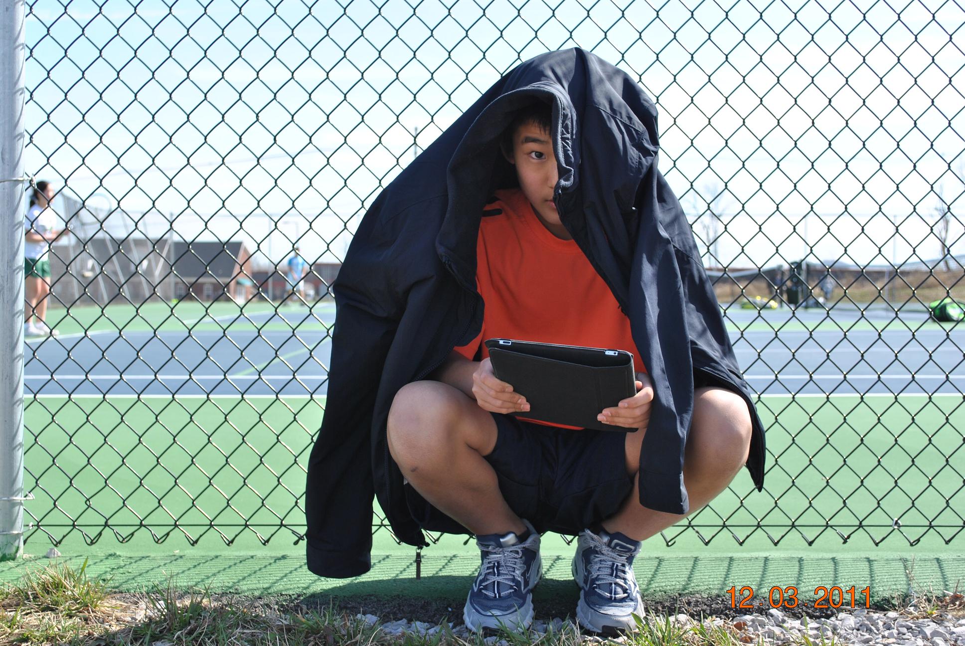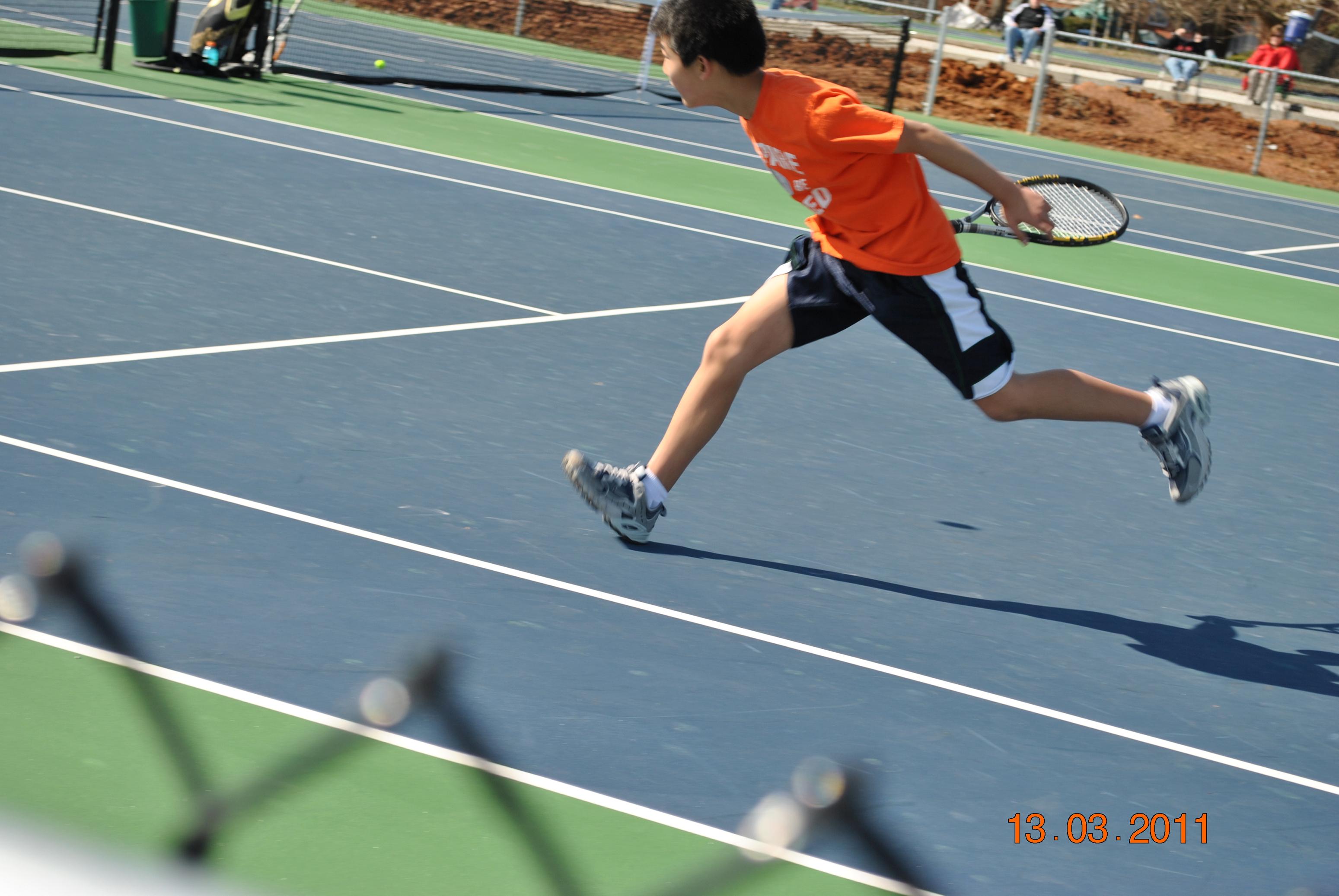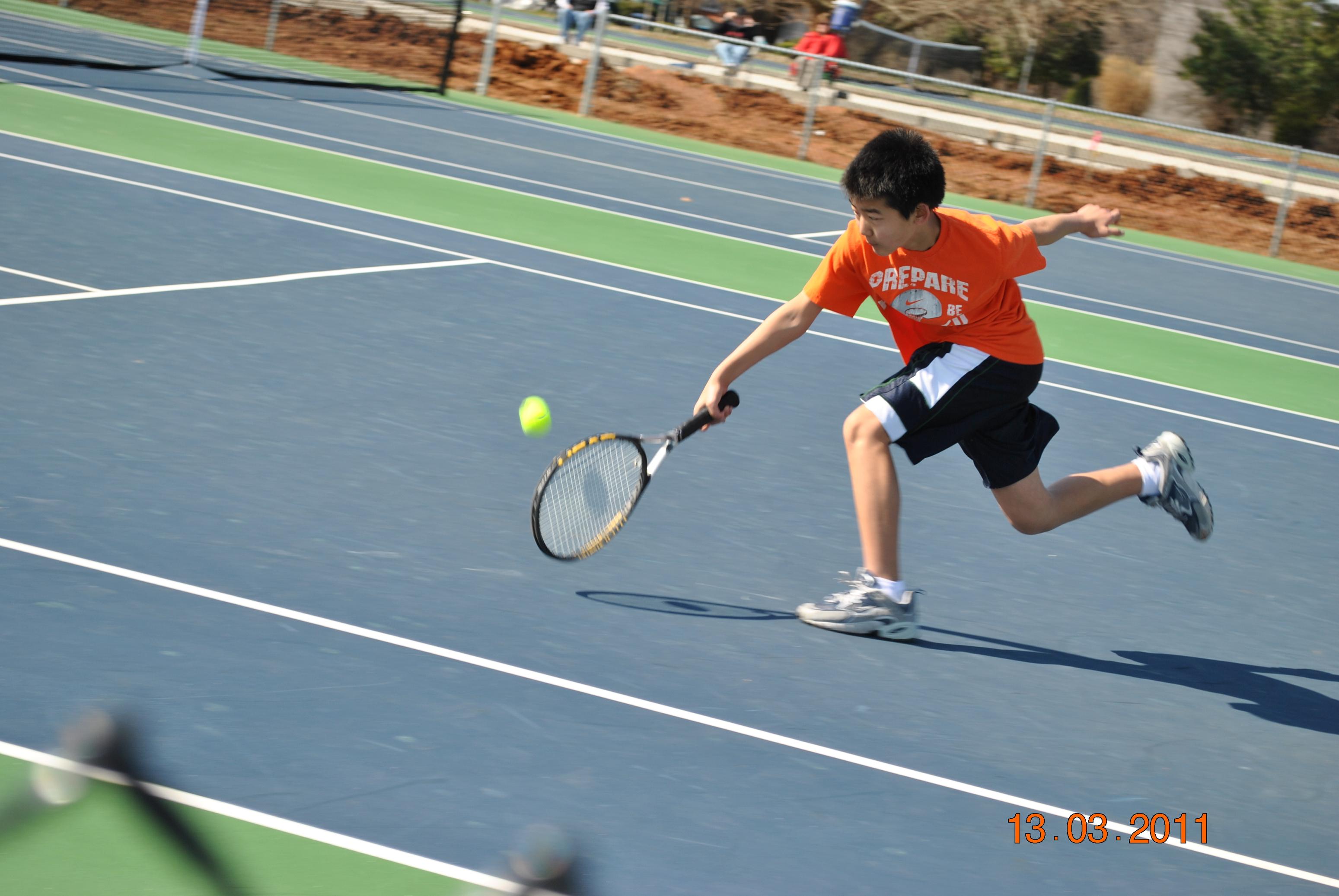 小拖的对手来是远道从Indianapolis来的,小男孩个头比小拖稍矮,精瘦。技术上应该说他俩旗鼓相当,不同是那孩子在球场上表现很腕儿,喊叫声不断,基本上我知道的英语感叹词都在他这里集合了,oh! Ouch! God! Gosh! Shit! Shoot! What!一个球触网没过去,他大声冲球吼叫:Get over! 小拖吊了一个高球,太阳光刺眼,他失手了,又冲太阳抱怨:I cannot even see it! 小拖听了他这话,就开始凭凭吊高球,屡试不爽。呵呵,这个坏小子。
