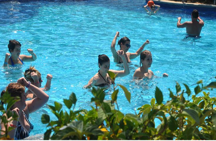 一帥哥帶領一幫美女跳操。帥哥在岸上跳,水裡的波濤洶湧一覽無遺,這工作很適合某某和某某某村民:)