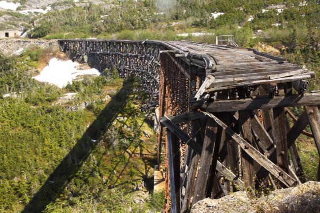 這是一段廢棄的鐵路橋,很容易讓人聯想以前看過的那個“卡桑德拉大橋”。橋的中間支撐部分用鋼材,靠兩岸的都是用木材,100多年前的鋼材還是比較值錢的。