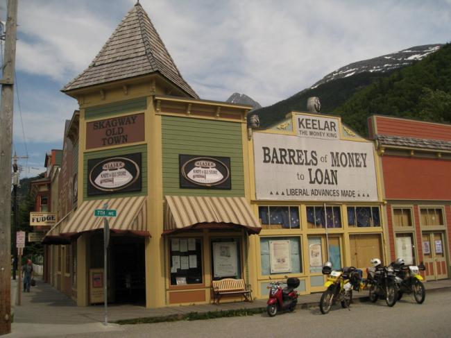 19世紀末繼加州之後ALASKA也出現了一股淘金熱,這股淘金浪潮匯聚的中心就在SKAGWAY,因為這裡是離礦區最近的登陸地點。因為當時ALASKA和加拿大已經嚴格劃分了邊疆,而有一部分礦區又處在加拿大境內,加拿大政府對採礦者的限制可謂是別出一格。她要求前去採礦的人必須攜帶足夠他本人一年的生活必需品,其中詳細列出了麵粉多少多少,培根多少多少,煙絲多少多少,奶油多少多少,槍支彈藥,等等等等。。。。。。,至少是400多磅。我猜這項政策的出台,出發點是為了可以確保一個時期之內礦區的穩定。根據以前的經驗,不論中外,凡是一出現淘金熱,總會有些恃強凌弱的人廁身其中。而這班人兩手空空到了礦區,全憑一副拳頭打天下,絕對是造成礦區不安定的因素。要是人人平等式的都自己搬生活用品進去,至少能保持一段的和諧。