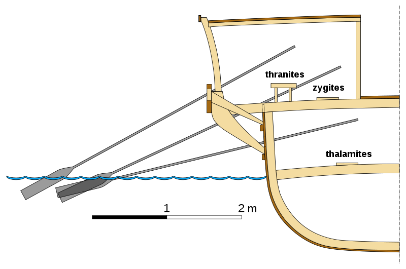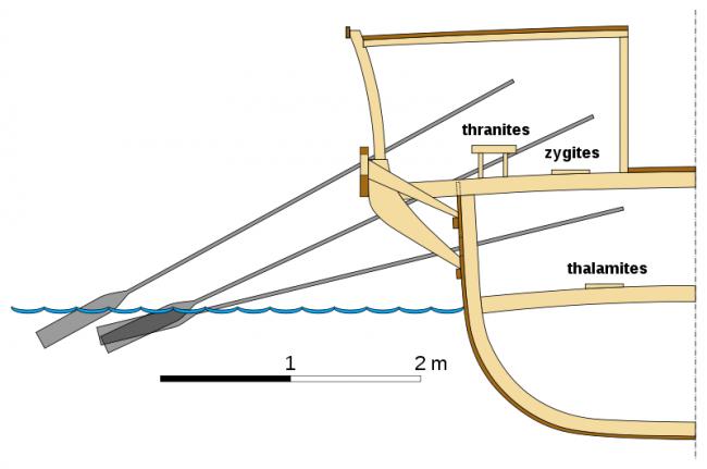 且看薩拉米斯大海戰雙方戰船及船上人員配備。 雙方主力戰船都是腓尼基設計的三層槳船的變種。希臘船長四十米,寬六米,船頭包銅皮,乘員二百。其中槳手一百七十,矛手十四,弓箭手四,其餘為指揮官水手信號手等。希臘船因船體狹窄,載貨量小,不適合遠航,但靈活性和抗風浪性好,速度也快。波斯船則更寬更高,吃水較淺,乘員中槳手一百二十,弓箭射手較多。波斯船載貨量大,能遠航,但靈活性速度及抗風浪性均遜於希臘船。但波斯艦隊中有二百零七艘“快船”,塊頭比較小。 且看雙方戰法特點。 雙方戰法特點都是要發揮船和人員配備的優勢。波斯大帝國一向兵多將廣,善於以優勢兵力壓倒敵人。海戰中他們善於以二三船夾擊一艘敵船,先圍住,亂箭射之,然後靠將上去,讓茅手長槍手刀斧手跳上敵船,用“剁”“砍”“斬”“劈”“刺”“捅”“扎”“戳”等等兇狠招數殺敵。敵船一被靠上,就基本玩完。希臘人因船速快,靈活性好,進攻中以船頭攔腰撞擊敵船為主。敵船一被撞翻,再多弓箭手茅手長槍手刀斧手也沒用,都成了希臘弓箭手的靶子。希臘又使用一種圓形加三角錐隊形,使得敵人很難分離包圍其單只船。雙方戰法特點鮮明,針對性極強。 且看雙方陣勢。 波斯包圍圈五重,又分左中又三路。左路愛奧尼亞人,善水戰,船技嫻熟。但愛奧尼亞人畢竟是希臘血統,跟希臘人作戰,士氣低落。而且其兵將來自許多不同小邦國,協調困難。中路波斯人,勇猛頑強,士氣高。但波斯水軍都是陸軍“改行”而來,雖經訓練,船技仍遠遜希臘人,而且許多人還不會游泳。右路腓尼基人,天生的航海家,海上行舟如履平地。但腓尼基人也是偽軍,士氣差紀律差。 希臘人以斯巴達人對陣愛奧尼亞人。斯巴達是傳統陸軍強國,海戰非其所長。且斯巴達王列奧尼達和三百勇士不久前在溫泉關被波斯“不死軍”殺死,也讓斯巴達人畏懼波斯的力量。雅典人和愛吉納人主攻腓尼基人。希臘這隊實力最強,是希臘海軍的精華。不僅單船戰鬥力超群,戰術素養高,在狹窄水域裡數量上也對敵方占優勢。其餘希臘戰艦則攻擊中路的波斯人。 風在吼,浪在叫,大海在咆哮。熱血在沸騰,神經在繃裂。戰神,帶着壯懷激烈,死神,帶着殘忍恐懼,終於降臨在這薩拉米斯海域裡的三十萬大軍的頭上。希臘人唱起了戰歌: Forward, sons of the Greeks, Liberate the fatherland, Liberate your children, your women, The altars of the gods of your fathers And the graves of your forebears: Now is the fight for everything. 希臘司令泰米斯特克利斯一聲令下,希臘軍中左兩路迅速接敵,弓箭手開弓放箭,箭如飛蝗(其中有不少帶火的),直撲波斯戰艦。波斯弓箭手以箭雨回擊。波斯船顛簸厲害,波斯弓箭手站立不穩,射箭失去準頭。第一波箭戰,波斯人已落下風。波斯前排戰艦稍向後撤試圖調整隊形,卻與後排向前推進的船糾纏在一起。中路希臘船殺到,一頓猛撞,波斯船一下子被撞翻多艘,陣腳大亂。好在此段波斯船多勢眾,他們回過神來,開始反攻。雙方你來我往,纏鬥起來。