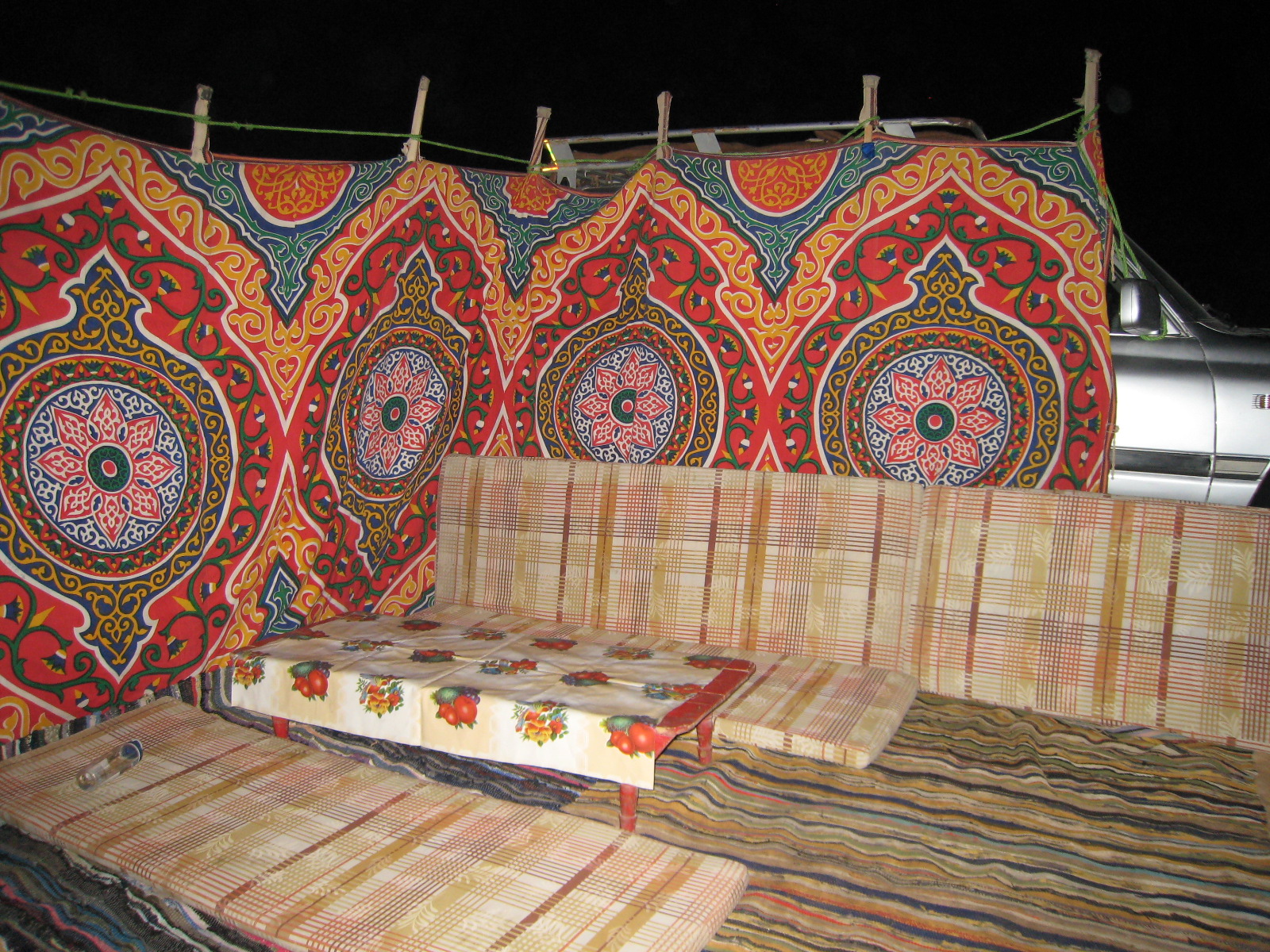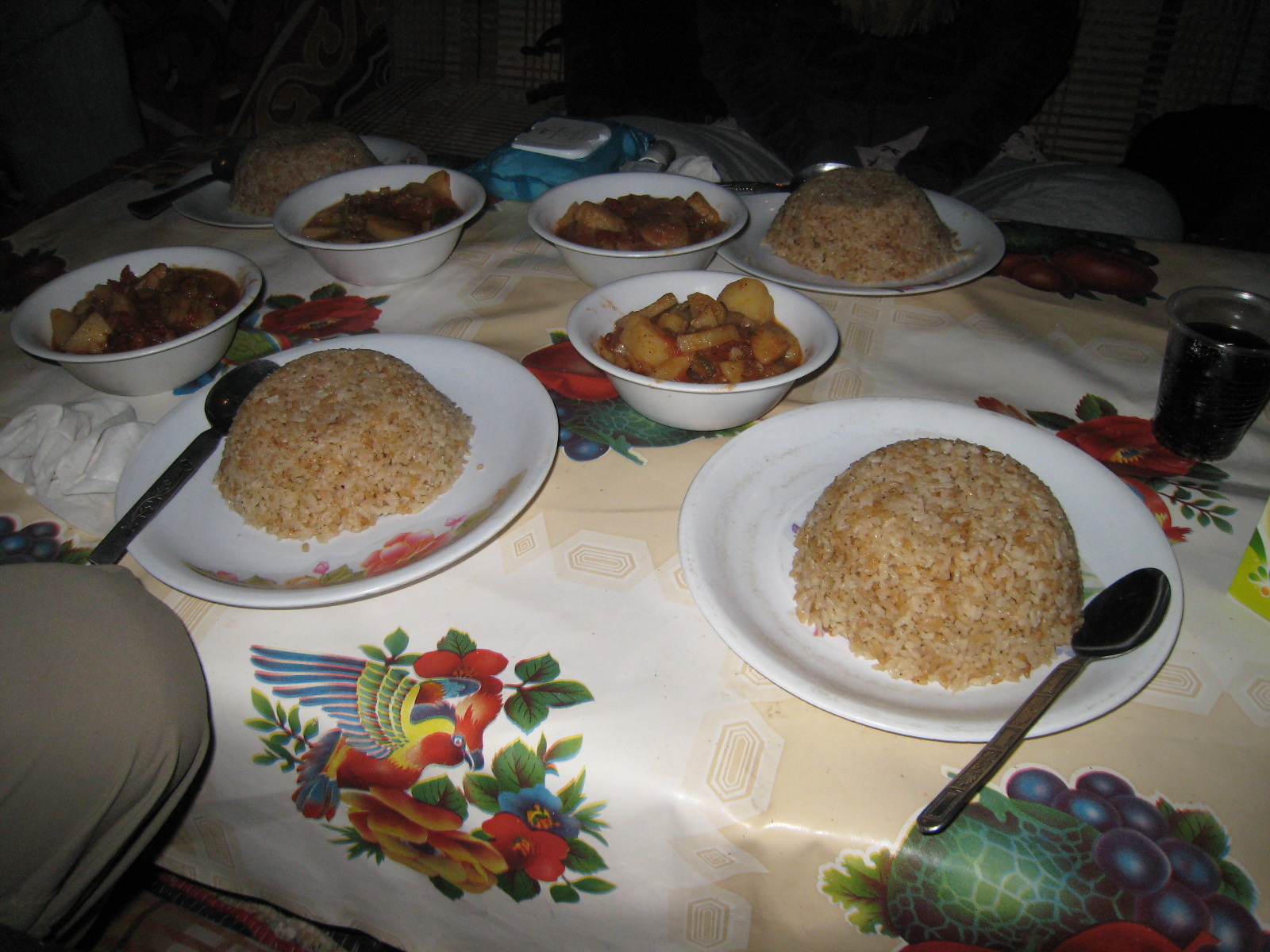 挡风的围子,饭桌,和睡觉用的垫子 大哥给我们做的晚饭:土豆西红柿炖鸡和米饭 清早,收拾帐篷 沙漠的日出