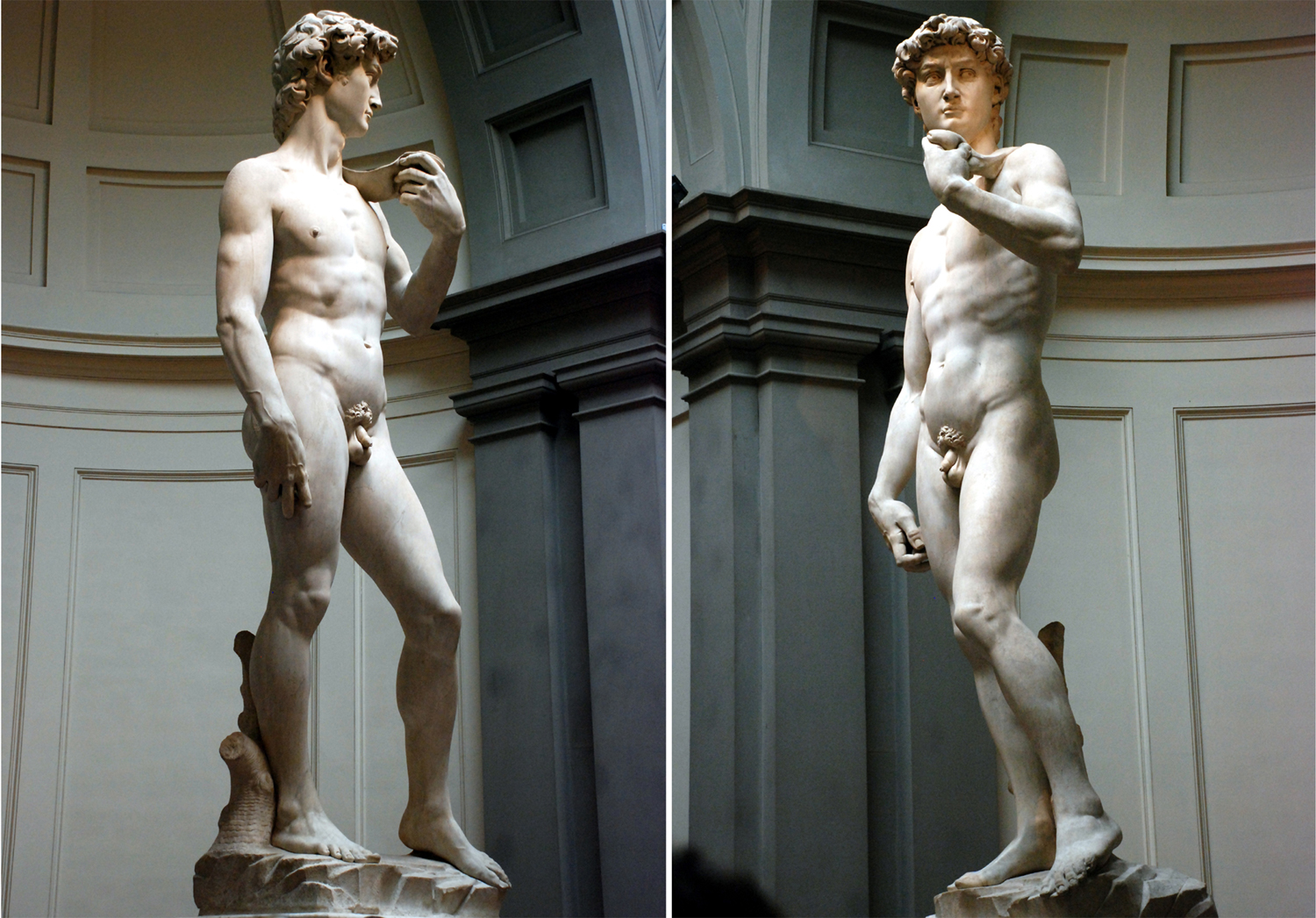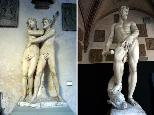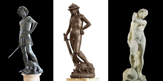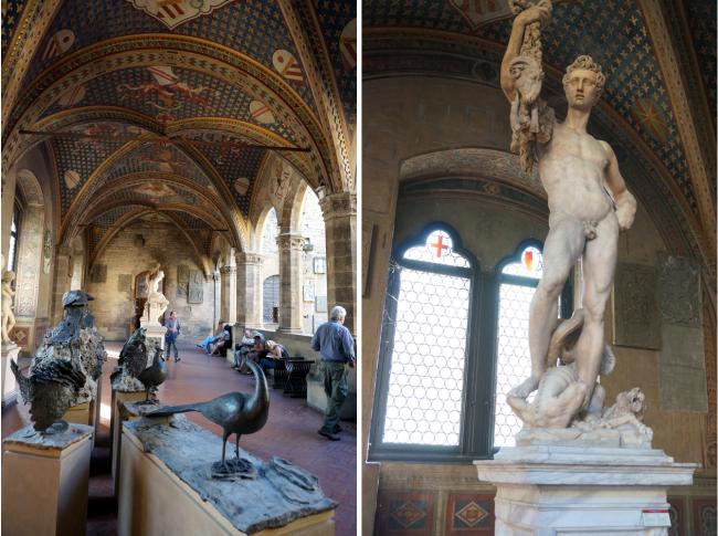 多納泰羅(左)、委羅基奧(中)和米開朗基羅(右)的大衛 地面迴廊的雕塑 二樓走廊的雕塑