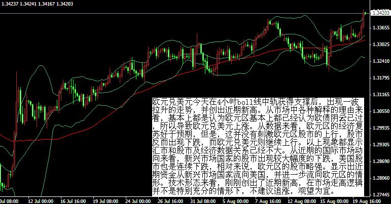 歐元兌美元今天在4小時boll線中軌獲得支撐後,出現一波拉升的走勢,並創出近期新高。從市場中各種解釋的理由來看,基本上都是認為歐元區基本上都已經 認為歐債陰雲已過,所以導致歐元兌美元上漲。從數據來看,歐元區的經濟復甦好於預期,但是,這並沒有刺激歐元區股市的上行,股市反而出現下跌,而歐元兌美 元則繼續上行。以上現象都顯示匯市和股市及經濟數據關係已經不大。從近期的國際市場動向來看,新興市場國家的股市出現較大幅度的下跌,美國股市也是連續下 跌,相對來說,歐元區的股市略強。顯示出近期資金從新興市場國家流向美國,並進一步流向歐元區的情形。技術形態來看,剛剛創出了近期新高,在市場走高邏輯 並不是特別充分的情形下,不建議追漲,觀望為宜。