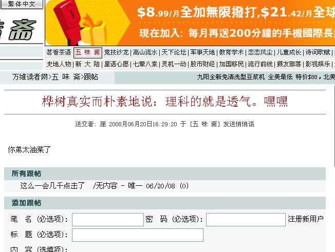 | 送交者: 孤亡魂 2008月06月20日23:49:44 於 [茗香茶語] 發送悄悄話 |