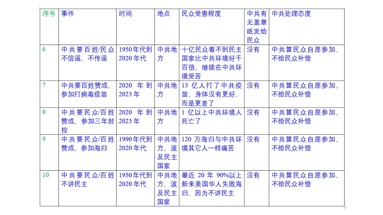 中共地方毫无法制证据/现象十:中共要华人赞成专制,不讲民主,没有盖章纸发到百姓手里。号召发出在中共地方,民主国家不是中共辖区。华人说,“听中共的,没讲民主,没有拿到民主国家国籍,失败海归了,在中共环境生活困苦。”中共官员会说,“哪个中共官员或哪个中共党委强迫你不讲民主了,你能拿出依据/证据吗?”你百姓拿不出来。中共官员会说,“既然你拿不出来,就只能算你自愿不讲民主,没人强迫你这样,也就没有补偿了。”