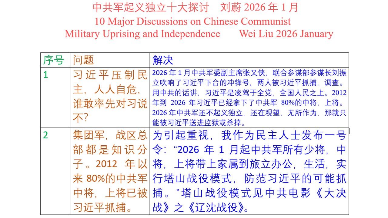 中共军起义独立探讨一:张又侠,刘振立吹响了习近平下台的冲锋号。2026年1月18日张又侠意图在京西宾馆抓捕习近平。不料行动前两小时,习近平获得消息,撤离了京西宾馆。张又侠的卫队与习近平的卫队在京西宾馆发生枪战。1月24日中共国防部宣布张又侠,刘振立违纪违法被调查。据悉同时习近平要求13个集团军的司令,5个战区的司令,8个军兵种的司令表示支持习的行动,到1月28日,4天过去了,26个司令中,没有哪个司令表示支持习。这在以往是不可想象的。用中共的话讲,习近平是凌驾于全党,全国人民之上。 中共军起义独立探讨二:中共军少将,中将,上将从2026年1月起实行塔山战役模式,将军全部到部队,现在的旅里去,家属也带到旅里去。塔山战役模式见中共电影《大决战》之《辽沈战役》。2000年以来,中共军的军部,战区司令部,八一大楼都是知识分子成堆的地方。打字的手能打枪吗?习近平掌握了警察,特勤局,随时能来军区大楼抓中共军将军。所以中共军将军只有到旅里面工作,生活,才能有安全。旅有围墙,岗哨,习的特警也进不来。习的特警来估计也就30支步枪或手枪,一个旅4000人配备有步枪,机枪,火箭筒,完全可以把习的特警消灭掉。中共将军,别人都来抓你了,你还要手软吗?将军可以自己选择自己的办公,生活地点。至于军部,战区司令部的知识分子让他们继续在那里做数学题,化学题。题做好了,用电子邮件发给在旅里的将军。为了引起中共军将军的重视,我们民主人士把这叫民主人士给中共军将军的一号令:少将,中将,上将从2026年1月起本人及家属下到旅里,实行塔山战役模式。 中共军起义独立探讨三:中共军起义独立的动力:士兵不再是奴隶。中共军实行奴化管理,不给士兵自由,隐私。实行一系列折磨人的制度,包括杯子,牙膏,肥皂盒等要拍成一条线,被子要叠成豆腐块,等内务管理。士兵怎么走路都管,包括齐步走,队列训练,一个连所有必须在同一秒迈左腿,同一秒迈右腿。士兵去哪里都要向班长报告。士兵四人,五人住一个房间,床除了晚上睡觉,白天不能坐,不能躺。手机随时被查看,收走。下午5点后,中共军还必须看晚上7点的《新闻联播》,还有晚上9点的晚点名。传说中的奴隶制也没有这么残酷。中共军起义独立后,无论是多少人,都废除掉这些侵犯人权的制度,杯子,牙膏,手机本来就是私人物品,长官无权过问。士兵住宿上下铺取消,可以用墙板,分割大房间,安门,安锁,不是高科技,做到士兵一人一间卧室。军人与其它行业一样,有人权,有隐私,有纪律。作息时间上午6点半出操,下午5点下班。晚上值班的就是白天休息。 中共军起义独立探讨四:起义独立的一个营,一个旅如何获得弹药,油料。中共军按旅为单位驻军,一个旅有一个弹药库。习近平最怕中共军起义或造反,所以中共军需要的弹药,油料,食材,医疗都是后勤保障部队管理。也就是旅里自己是没有弹药的。在2020年代,习近平搞得天怒人怨的情况下,中共军一个普通士兵也能发挥巨大作用。比如步兵营士兵A与保障部队士兵B是朋友,那就可以说了。平时各种制度约束,谁也难开绿灯。但真到了起义独立那天,那真不同了。在习近平治下,生活基本上是痛苦,难有快乐。不起义独立,那就是任人宰割。营里可能有少量弹药,指战员每人平时收集几发子弹也是可能的。一个弹药库平时也就保障部队几十人把守,如果强攻,几百发子弹就能攻下来。一个营,一个连获得油料的办法类似。看守弹药,油料的都来自普通百姓,谁不厌恶习近平?起义独立部队从保障部队获得食材,医疗的难度应该更小。 中共军起义独立探讨五:起义独立军如何获得钱。中共军在1990年代,2000年代比禁止经商,到2020年代没有财源了。中共起义独立后,钱从哪里来?习近平政权不可能再给起义军钱。人民币是中国人民银行发行,人民币印刷厂只听中国人民银行的命令印多少钱。金融体系掌握在习近平手里。起义独立军,无论是一个营,一个旅,一个集团军要想再获得人民币都不现实。那就自己印刷货币,叫华元,什么元都可以。印刷货币主要是防伪,别人不能伪造。大约是三台印刷机。第一台印刷机印刷几种防伪标志,包括水印。第二台印刷机印刷钞票图案。第三台印刷机印刷钞票的数字和编号。中共军在1920年代就能自己印钱,现在2020年代,100年过去了,起义独立军也可以自己印钱。 中共军起义独立探讨六:起义军是就地独立,还是打向北京?一个县独立了,也要通电全球,说清楚,习近平不派兵来打起义独立军,起义独立军也不打北京,就呆在原地。如果习近平派兵来打起义军,那起义军如果在本县打败了习家军,就可能打向北京。我们民主人士的建议是就地独立,在一个县,或几个县,如陕南,皖北独立,而不是打向北京。我是在军队工作过几年了,在美军第一步兵师工作了三年。部队到另一个地方去有士兵住宿,油料,交通等大问题。起义独立后,士兵在营房里有单间住,到另一个地方住大帐篷,就是几十人一个房间了,帐篷有没有暖气,难啊。铁路,机场都掌握在习近平手里,火车司机,民航飞行员按体制不能运送起义军。这里涉及我们谈的下一个问题,12亿民众如何参与起义独立或帮助中共军起义独立? 中共军起义独立探讨七:12亿民众如何参加/帮助中共军起义独立。武器面前人人平等。不要再想着中共的官阶了。中共环境的农人,工人,失业人,家庭主妇完全