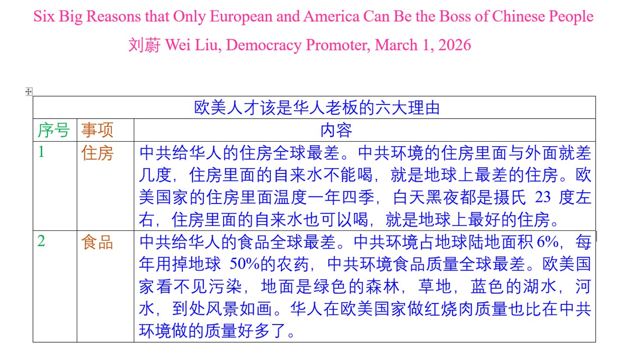 Wei Liu, Democracy Promoter, No. 1 Reason of Only European, American Can Be the Boss of Chinese People: Housing 1015