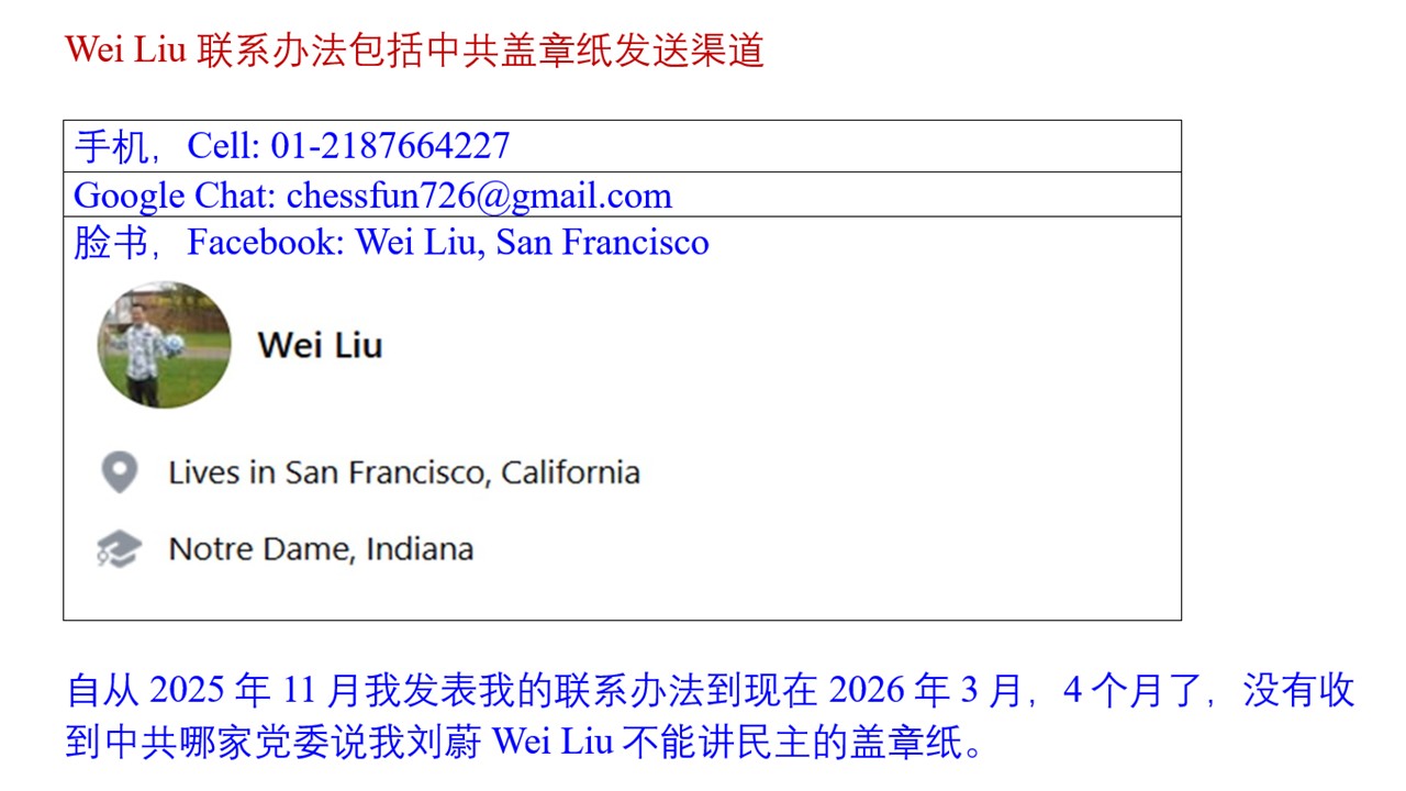 劉蔚:歐美人才該是華人老闆理由五:娛樂 1019 Wei Liu, Democracy Promoter, No. 5 Reason of Only European, American Can Be the Boss of Chinese People: Pleasure 1019 民主人士/普通百姓/民人 劉蔚 2026年3月YouTube了。 2026年3月8日 YouTube Now. March 8, 2026. Virus is made in China; Global Warmingis made in China; Fentanyl is made in China. I started talking about democracy in the 2000s. The 2020s is my third decade talking about democracy. There is no Stamped Paper from Chinese Communist saying that I cannot talk about democracy. I have three channels to receive information of the world. My cell phone: 01-2187664227, Google Chat: chessfun726@gmail.com, Facebook: Wei Liu, San Francisco, man with a soccer ball. After I published my contact in November, 2025, till now March 2026, 4 months passed, there is no stamped paper from Chinese Communist stating that I cannot talk about democracy. Acclaim! On February 28, 2026, America launched a war named “Epic Fury” against Iran, using about 700 military planes, with Israel as the ally. Air strike was in daylight. There is information including Trump’s words that Iran’s Supreme Leader Khamenei was killed. Trump has called Iran people to take over Iranian Government when America’s military strike is over. Democracy Promoters like me gave No. 1 Order to all Chinese generals: Go and live, work in brigade to prevent being arrested by Communist Leader Xi Jinping. Since 2012 Xi came into power in China, 80 two-star generals and three-star generals of Communist Military were detained/arrested by Xi, while the total number of two-star generals and three-star generals in China in any given year since 2010 is about 100, meaning 80% of generals were sent to jail by Xi. Most Chinese either inside China or outside China tends to use words of the Communist, like not talking about politics when hearing negative comments on Communist China. Language or words are the think state of human. If A imitates B’s language, A tends to think including subconsciously that B is A’s boss. It is so bad for one to regard Chinese Communist as one’s boss. Because Chinese Communist only gives misery, not good life, to people. Only people in democratic countries, like Europe and America, should be the boss of Chinese people including inside China and outside China. The following is the six big reasons/issues that only people in democratic countries can be the boss of Chinese people. Pictures of this episode is included. No. 1 Reason of only European and American can be the boss of Chinese people: The housing given by Chinese Communist to Chinese people is so poor, with running water inside building not drinkable and temperature inside building only see several degrees difference from outside. The housing given by European and American to Chinese people is so good, with running inside building drinkable and temperature inside building stay around 23 C or 73 F all year around. No. 2 Reason of only European and American can be the boss of Chinese people: Food. China occupies about 6% of world’s land area and every year it consumes 50% of world’s pesticide. Food quality in China is worst among the world. In Europe, America, the ground is green woods, blue waters, and the food is the best in the world. Chinese dishes in Europe, in America including made at home or in restaurant is much, much, much better than Chinese dishes in China. No. 3 Reason of only European and American can be the boss of Chinese people: Currency. Currency in China, Renminbi, cannot buy land, cannot freely exchange with foreign currency, price in China increases about 30% every year. Renminbi is not currency in real sense. Currency in Europe and America can buy land, can freely exchange with foreign currency, price here is largely stable. European Dollar and U. S. Dollar is currency in real sense. No. 4 Reason of only European and American can be the boss of Chinese people: Information. It is in China or Chinese people that block information including Chinese language information the most. Even in America, Chinese tourist guide tells Chinese tourists not to take newspaper for democracy. Europeans, Americans do not block information at all and let people themselves decide what information is good and what information is bad. No. 5 Reason of only European and American can be the boss of Chinese people: Pleasure. The pleasures of Chinese people like Chinese food, Go, Chinese Chess have much more space in Europe and American than in China. Because in China, Chinese people don’t have money and can hardly have those pleasures. For example, in Europe and America, a Chinese person can buy one Chinese food every week; in China, one can do it probably once in several months. There is information that in 2024 Vice Chair of Chinese Military Committee Zhang Youxia obtained most of Chinese Military power when Xi Jinping suffered a stroke. In 2025, 9 generals of Xi Jinping were announced removal of their Communist Party membership and Military membership. In January 18, 2026, gun fire exchanged between Zhang’s guards and Xi’s guards, with none of the two on site. On January 24, Military Department announced top generals Zhang Youxia and Liu Zhenli are under investigation. Xi Jinping demanded commander of each of the 13 armies in China, commander of each of 5 theaters and commander of each of the 8 forces to express their support for Xi. Till February 8, 2026, 15 days after the demand, none of the 26 high commanders has expressed their support for Xi, which is totally different from the past in Communist China. Top Generals Zhang Youxia, Liu Zhenli blew the trump to overthrow Xi Jinping Regime. Whoever opposes Xi Jinping, we Democracy Promoters supports whoever. We Democracy Promoters support Zhang Youxia and Liu Zhenli. 10 Discussions of Communist Military uprising and independence are published in February 2026. In 2025, male actor Yu Menglong, who has30 million fans in Commun