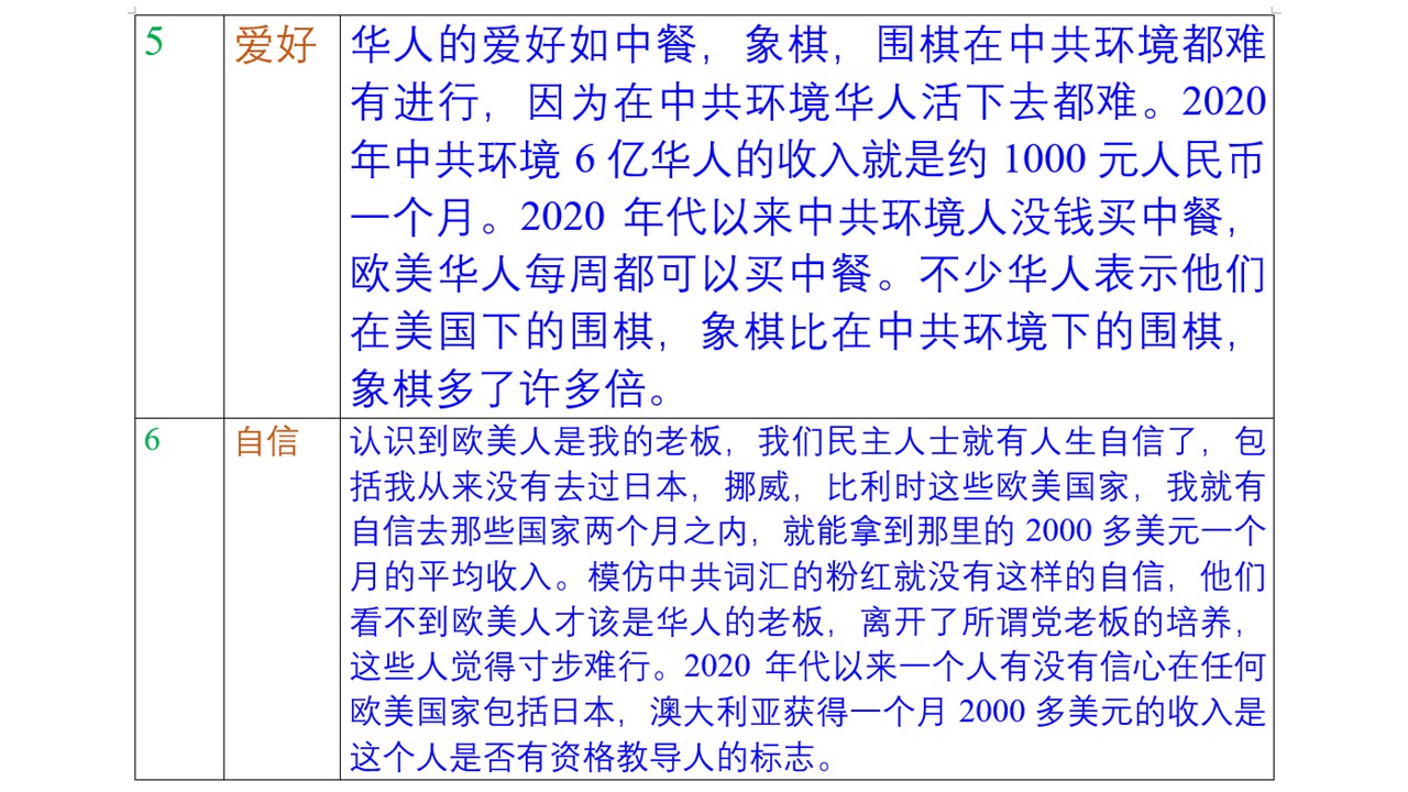 歐美人才該是華人老闆理由一:中共給華人的住房全球最差。中共環境的住房裡面與外面就差幾度,住房裡面的自來水不能喝,就是地球上最差的住房。歐美國家的住房裡面溫度一年四季,白天黑夜都是攝氏23度左右,住房裡面的自來水也可以喝,就是地球上最好的住房。 歐美人才該是華人老闆理由二:中共給華人的食品全球最差。中共環境占地球陸地面積6%,每年用掉地球50%的農藥,中共環境食品質量全球最差。歐美國家看不見污染,地名的綠色的森林,草地,藍色的湖水,河水,到處風景如畫。華人在歐美國家做紅燒肉質量也比在中共環境做的質量好多了。 歐美人才該是華人老闆理由三:中共給華人的貨幣全球最差。人民幣不能購買土地,不能與外幣自由兌換,中共環境物價每年上漲30%,人民幣是毫無信用的貨幣,就是廢紙。歐元,美元,日元,澳元都是可以買土地的真貨幣。歐美國家平均收入,包括退休金,一個月2000多美元。在歐美的華人做老闆的單位給華人的工資也是最低的。比如2000年代美國明尼蘇達的最低工資一小時是約6美元,華人單位能給華人一小時3美元多的工資。 歐美人才該是華人老闆理由四:中共對華人進行信息封閉,歐美人給華人信息自由。恰恰是中文在中共環境被封鎖得最厲害。來到歐美國家,包括泰國,印度,日本,華人每天下班後上網,看到的中文節目是中共環境的千百倍。在美國紐約一帶,有華人導遊勸華人遊客不要去拿民主報紙。歐美人是不會這樣的。歐美人不封鎖信息,是讓民眾自己鑑別什麼信息好,什麼信息壞。 歐美人才該是華人老闆理由五:華人的愛好如中餐,象棋,圍棋在中共環境都難有進行,因為在中共環境華人活下去都難。2020年中共環境6億華人的收入就是約1000元人民幣一個月。紅燒魚,回鍋肉在中共環境2020年代一個人一年能吃一次就不錯了。在歐美國家包括澳洲,日本,華人每天都可以吃紅燒魚,回鍋肉。華人在歐美國家下的象棋,圍棋也比在中共環境下的多多了。干任何事情你要有錢啊。在中共環境華人活下去都難,沒多少時間,精力下象棋,下圍棋。 歐美人才該是華人老闆理由/事項六:認識到歐美人是我的老闆,我們民主人士就有人生自信了,包括我從來沒有去過日本,挪威,比利時這些歐美國家,我就有自信去那些國家兩個月之內,就能拿到那裡的2000多美元一個月的平均收入。模仿中共詞彙的粉紅就沒有這樣的自信,他們看不到歐美人才該是華人的老闆,離開了所謂黨老闆的培養,這些人覺得寸步難行。2020年代以來一個人有沒有信心在任何歐美國家包括日本,澳大利亞獲得一個月2000多美元的收入是這個人是否有資格教導人的標誌。 人來到地球必須搞清楚一個根本事情就是誰或者哪群人才該是你的老闆?搞不清楚,搞錯了,那就是中共環境人包括海外粉紅糟糕的住房,食品,貨幣,信息。搞清楚了,搞對了,就是我們民主人士這樣,40歲以後可以選擇在美國任何一個州生活,有地球上有質量的住房,食品,貨幣,信息,一個月收入2000美元以上。